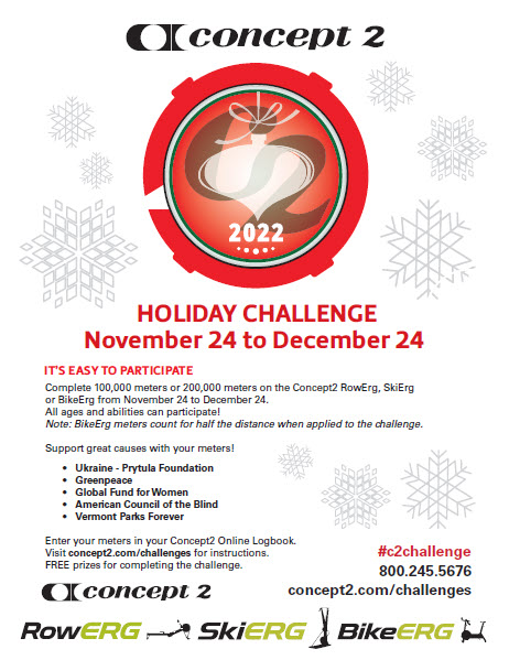 There's also a charitable giving aspect to the Holiday Challenge. Here's how it works: For every person who rows, skis or rides 100k during the challenge, Concept2 will donate $.02 per kilometer (1000 meters) to your choice of this year's charities. Once you get beyond 100k, we'll donate $.04 per additional kilometer. In order for your meters to count, however, you must choose a charity from the front page of your Logbook (or select "Let Concept2 Choose" if you don't have a preference). For kids and adaptive participants, the $.04 rate will take effect at 50k. Note: BikeErg meters count for half the distance when calculating your Holiday Challenge meters and any related donation.
